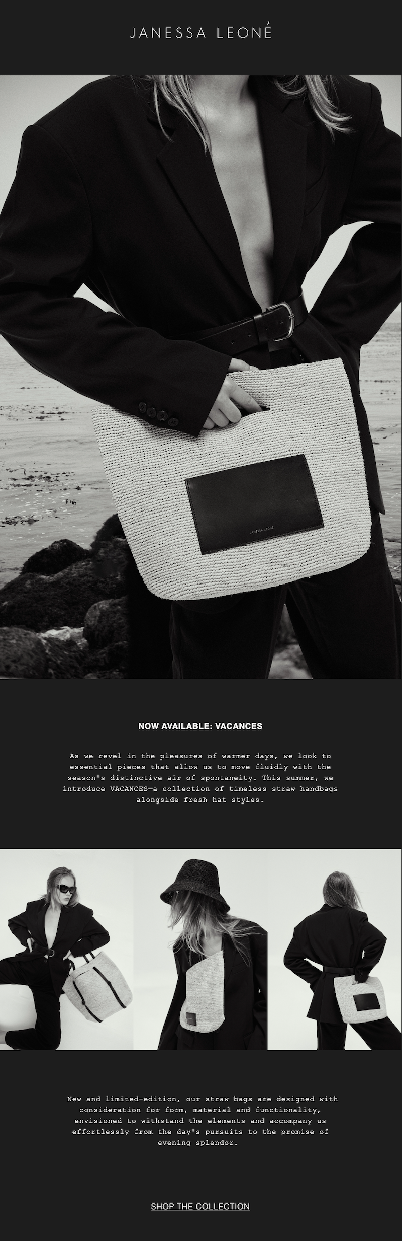 Known for packable hats, Janessa Leoné was looking to expand into new categories. The brand designed three limited-edition straw handbags, crocheted from the same sustainable raffia as their bestselling hat style.