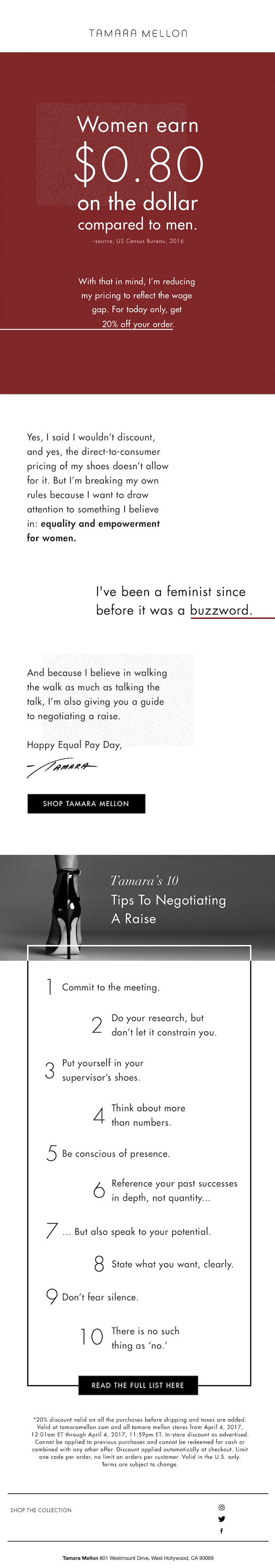 Tamara Mellon, founder of her eponymous shoe brand, launched a major multimedia campaign around Equal Pay Day, marking her website down to match the gender pay gap.
